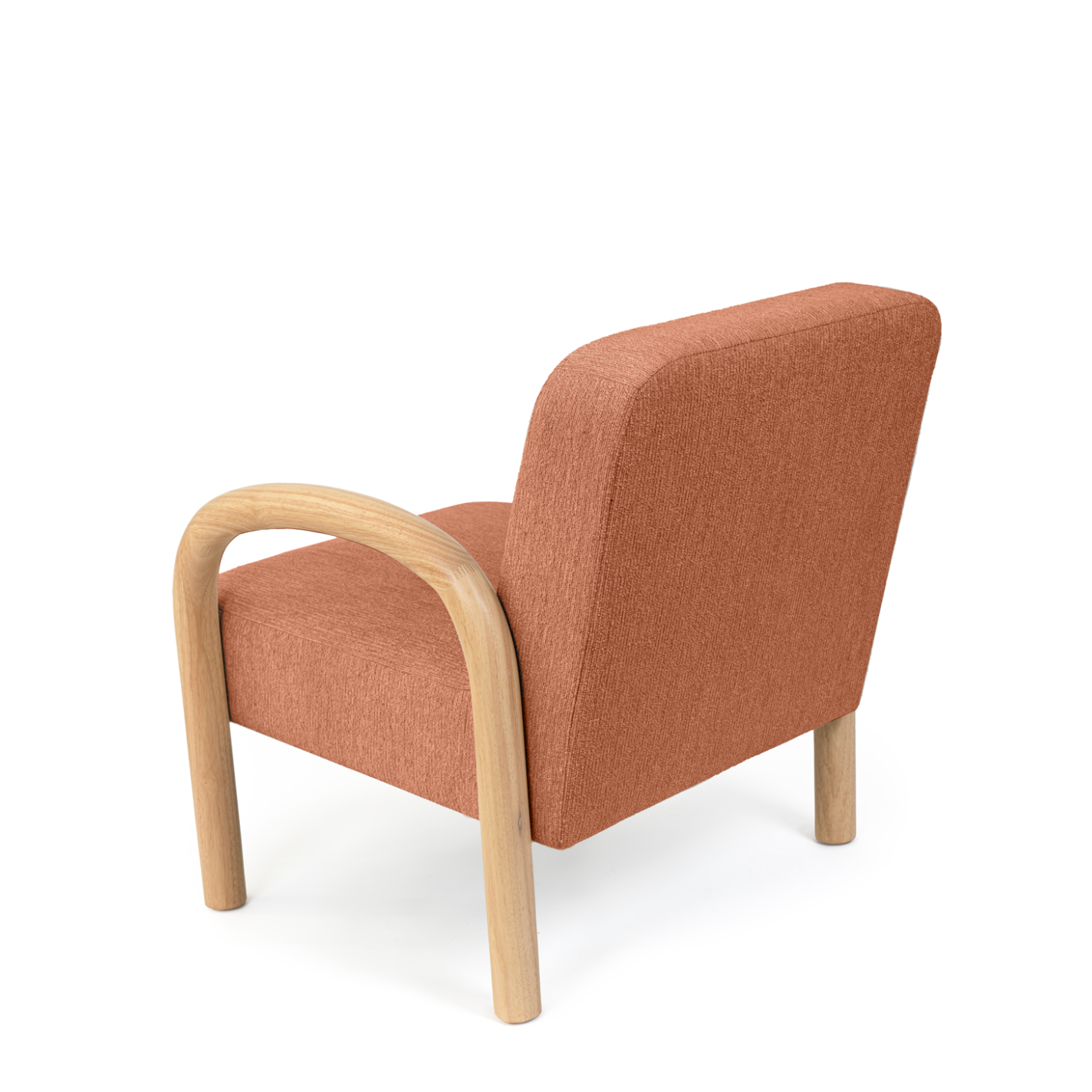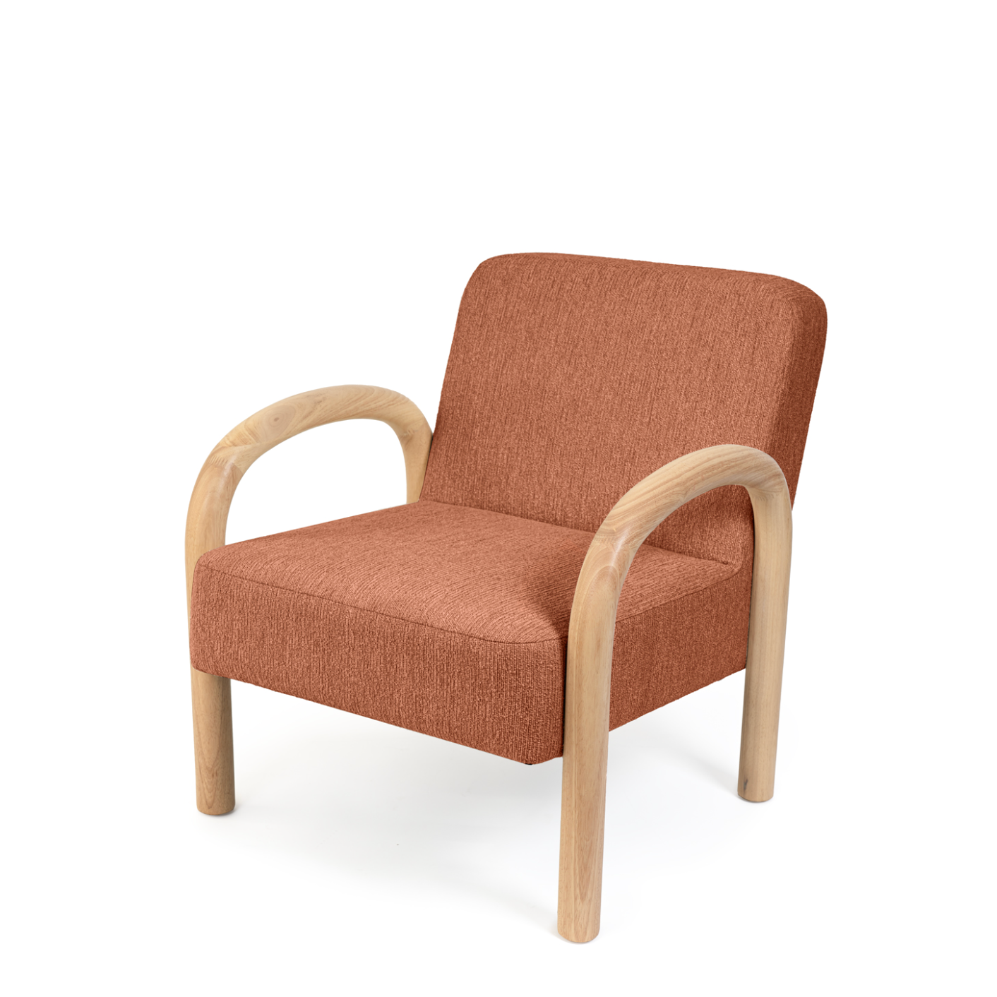 Butaca modelo Dorothy en tela Terrance color terracota. Patas redondeadas en madera de hevea natural