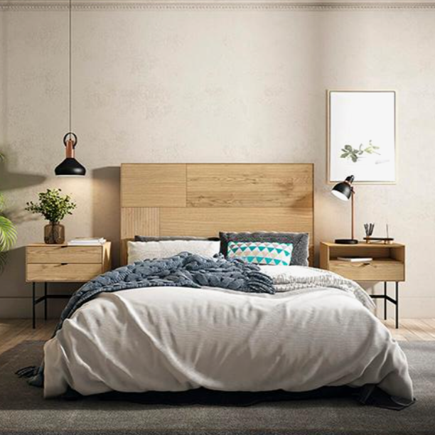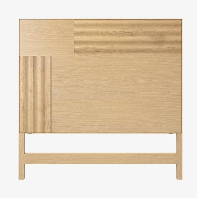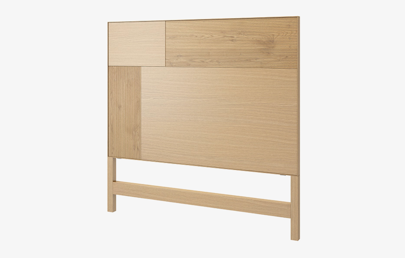 Puertas y cajones en madera maciza de roble rayado (en frontal) y con chapa de roble natural (en resto)