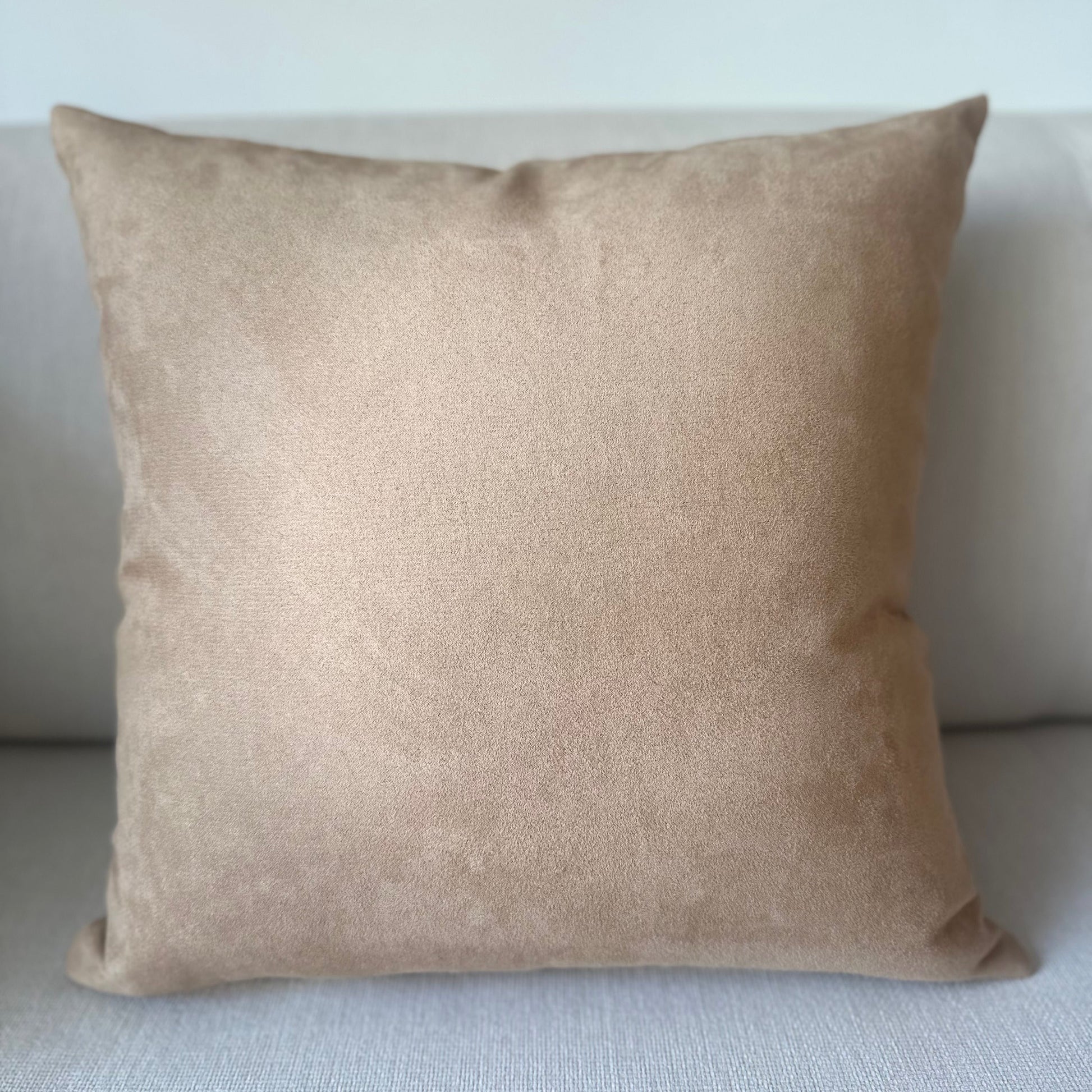 Cojín hecho en tela color camel claro efecto ante. Relleno incluido
