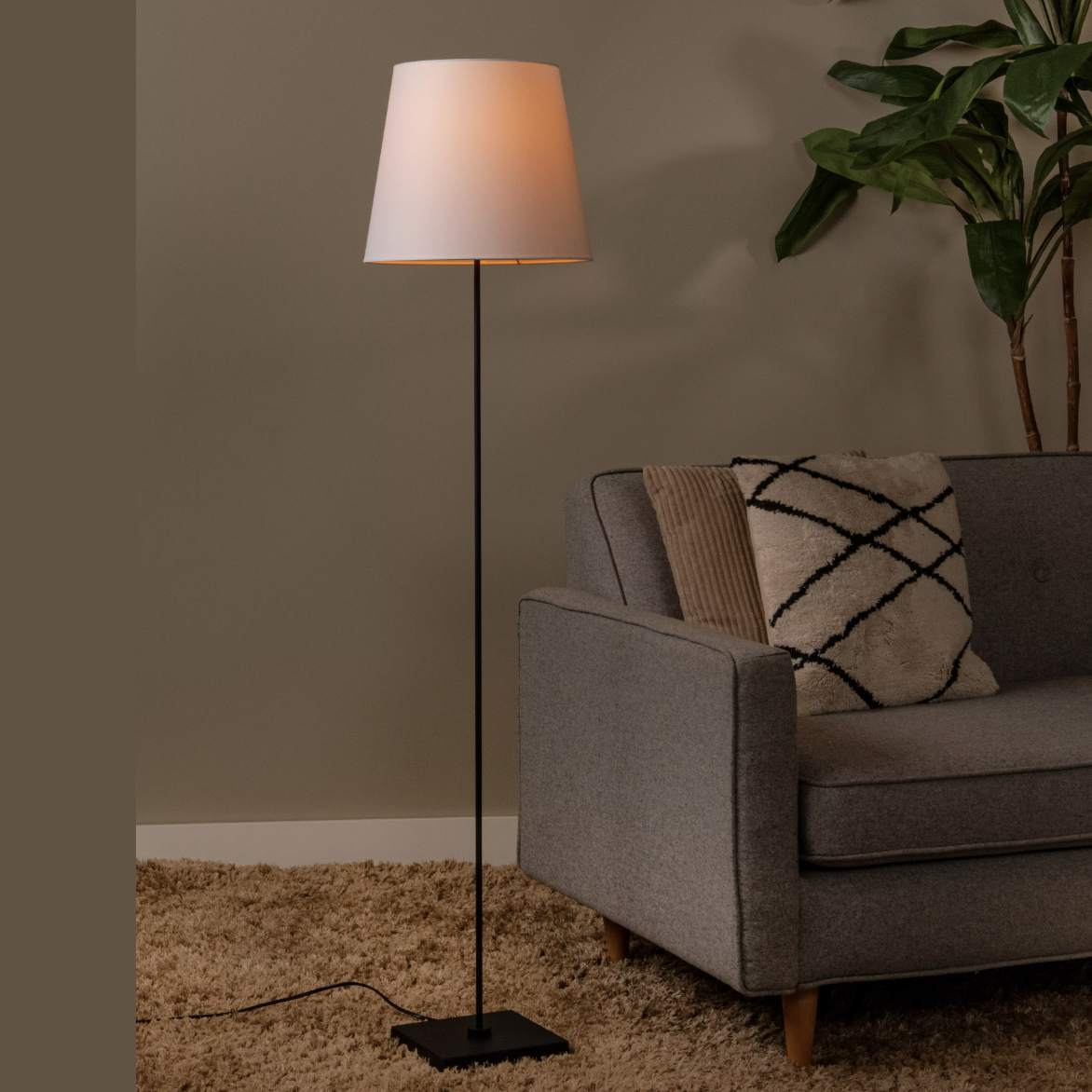 Lámpara de pie modelo Pendio de metal negro con pantalla de tela.